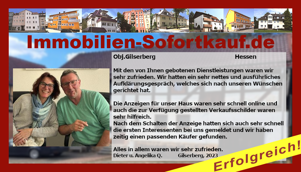 Mit den von Ihnen gebotenen Dienstleistungen waren wir sehr zufrieden. Wir hatten ein sehr nettes und ausführliches Aufklärungsgespräch welches sich nach unseren Wünschen gerichtet hat. Die Anzeigen für unser Haus waren sehr schnell online und auch die zur Verfügung gestellten Verkaufsschilder waren sehr hilfreich. Nach dem Schalten der Anzeige hatten sich auch sehr schnell die ersten Interessenten bei uns gemeldet und wir haben zeitig einen passenden Käufer gefunden. Alles in allem waren wir sehr zufrieden. Dieter und Angelika Q. Gilserberg, 2023