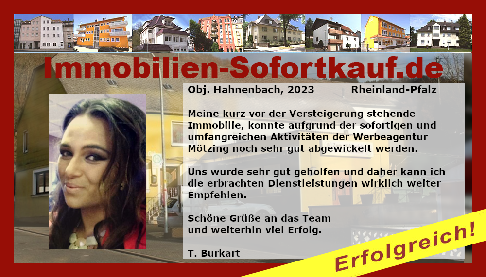 Meine Kurz vor der Versteigerung stehende Immobilie, konnte aufgrund der sofortigen und umfangreichen Aktivitäten der Werbeagentur Mötzing noch sehr gut abgewickelt werden. Uns wurde sehr gut geholfen und daher kann ich die erbrachten Dienstleistungen wirklich weiter Empfehlen. Schöne Grüße an das Team und weiterhin viel Erfolg. T. Burkart