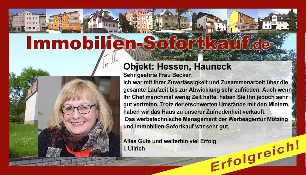 Sehr geehrte Frau Becker, ich war mit Ihrer Zuverlässigkeit und Zusammenarbeit über die gesamte Laufzeit bis zur Abwicklung sehr zufrieden. Auch wenn Ihr Chef manchmal wenig Zeit hatte, haben Sie Ihn jedoch sehr gut vertreten. Trotz der erschwerten Umständen mit den Mietern, haben wir das Haus zu unserer Zufriedenheit verkauft. Das webetechnische Management der Werbeagentur Mötzing und Immobilien-Sofortkauf war sehr gut. Alles Gute und weiterhin viel Erfolg. I. Ullrich