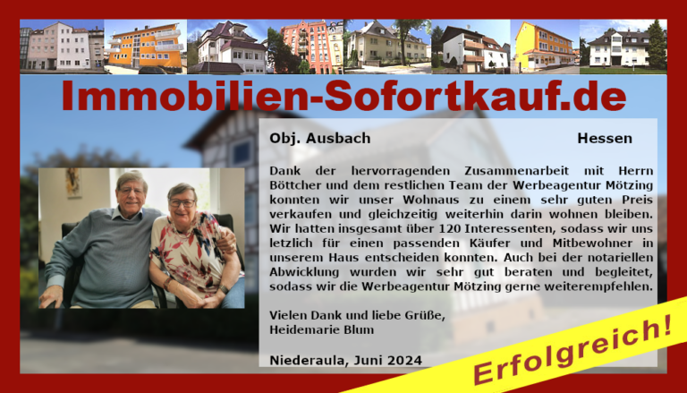 Dank der hervorragenden Zusammenarbeit mit Herrn Böttcher und dem restlichen Team der Werbeagentur Mötzing konnten wir unser Wohnhaus zu einem sehr guten Preis verkaufen und gleichzeitig weiterhin darin wohnen bleiben. Wir hatten insgesamt über 120 Interessenten, sodass wir uns letztlich für einen passenden Käufer und Mitbewohner in unserem Haus entscheiden konnten. Auch bei der notariellen Abwicklung wurden wir sehr gut beraten und begleitet, sodass wir die Werbeagentur Mötzing gerne weiterempfehlen. Vielen Dank und liebe Grüße, Heidemarie Blum, Niederaula, Juni 2024