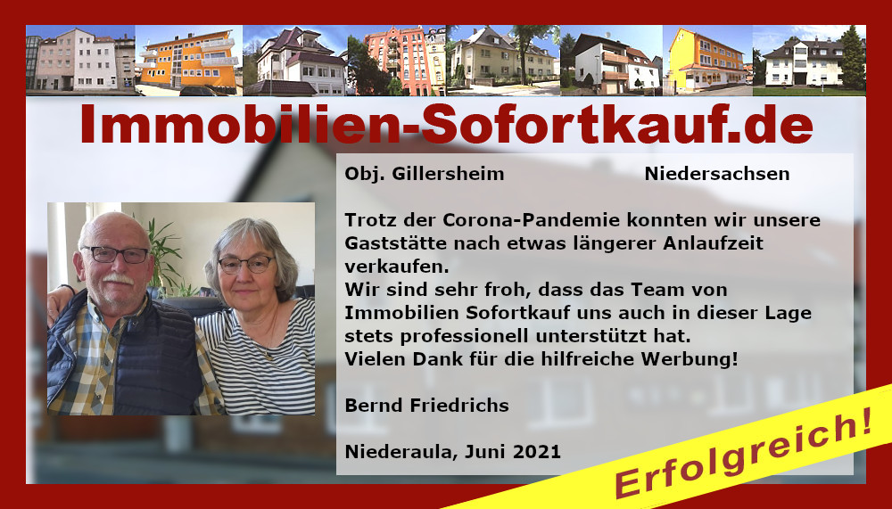 Trotz der Corona-Pandemie konnten wir unsere Gaststätte nach etwas längerer Anlaufzeit verkaufen. Wir sind sehr froh, dass das Team von Immobilien Sofortkauf uns auch in dieser Lage stets professionell unterstützt hat. Vielen Dank für die hilfreiche Werbung! Bernd Friedrichs Niederaula, Juni 2021