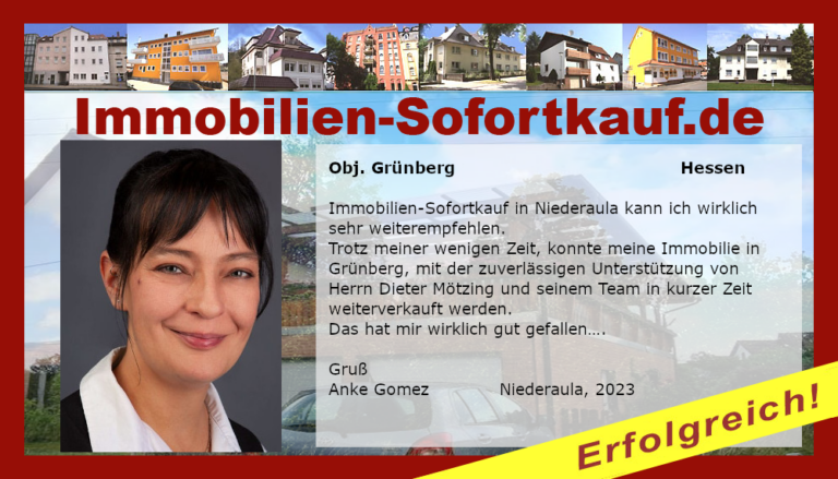Immobilien-Sofortkauf in Niederaula kann ich wirklich sehr weiterempfehlen. Trotz meiner wenigen Zeit, konnte meine Immobilie in Grünberg, mit der zuverlässigen Unterstützung von Herrn Dieter Mötzing und seinem Team in kurzer Zeit weiterverkauft werden. Das hat mir wirklich gut gefallen. Gruß Anke Gomez Niederaula 2023