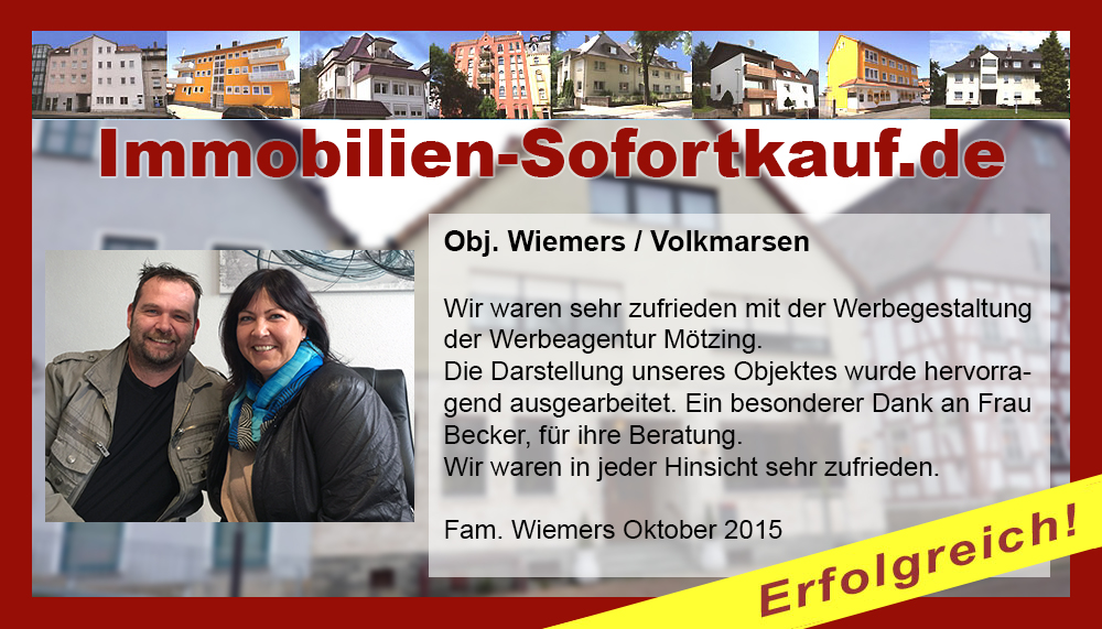 Wir waren sehr zufrieden mit der Werbegestaltung der Werbeagentur Mötzing. Die Darstellung unseres Objektes wurde hervorragend ausgearbeitet. Ein besonderer Dank an Frau Becker, für ihre Beratung. Wir waren in jeder Hinsicht sehr zufrieden. Fam. Wiemers Oktober 2015