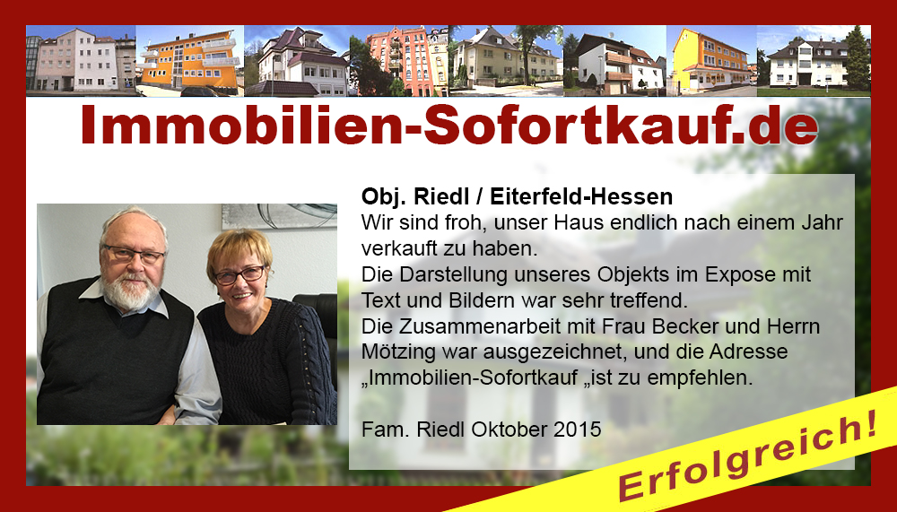 Wir sind froh, unser Haus endlich nach einem Jahr verkauft zu haben. Die Darstellung unseres Objekts im Expose mit Text und Bildern war sehr treffend. Die Zusammenarbeit mit Frau Becker und Herrn Mötzing war ausgezeichnet, und die Adresse Immobilien-Sofortkauf.de ist zu empfehlen. Fam. Riedl Oktober 2015